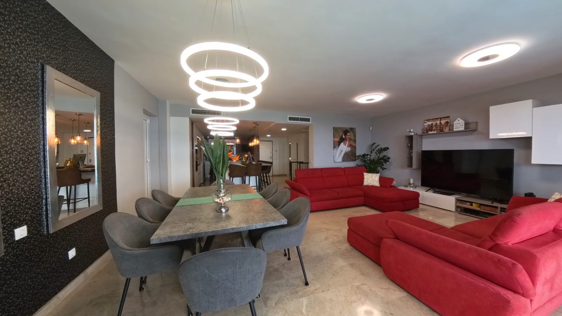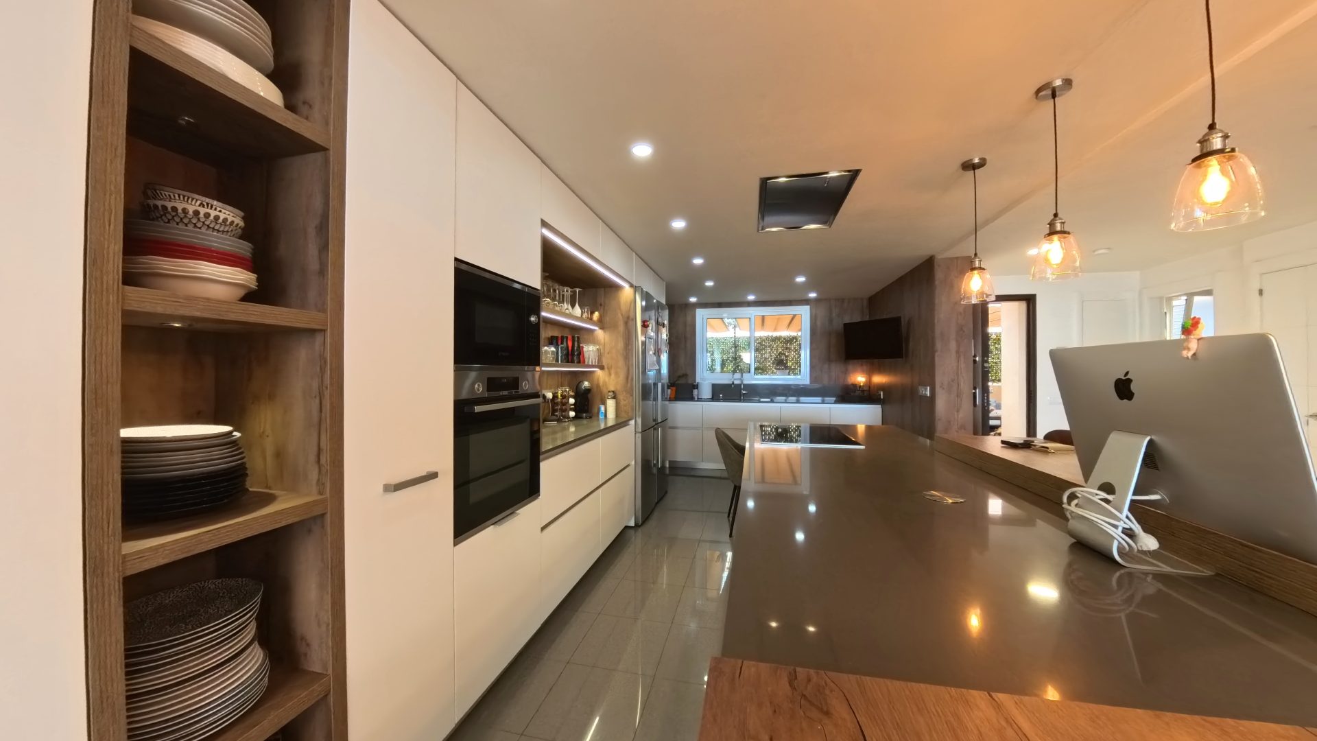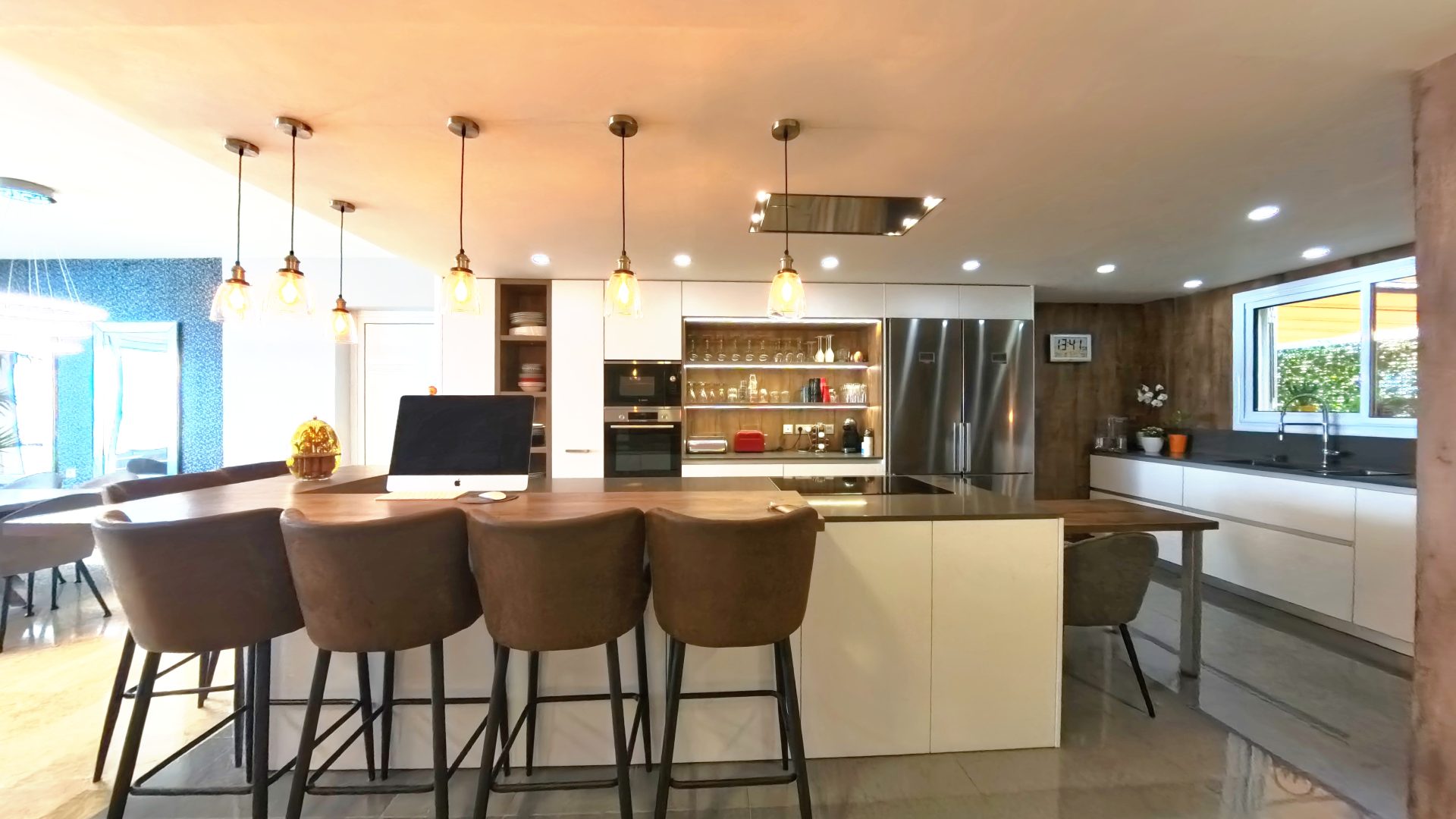 Cocina moderna de diseño abierto con isla (equipada con electrodomésticos de alta gama).